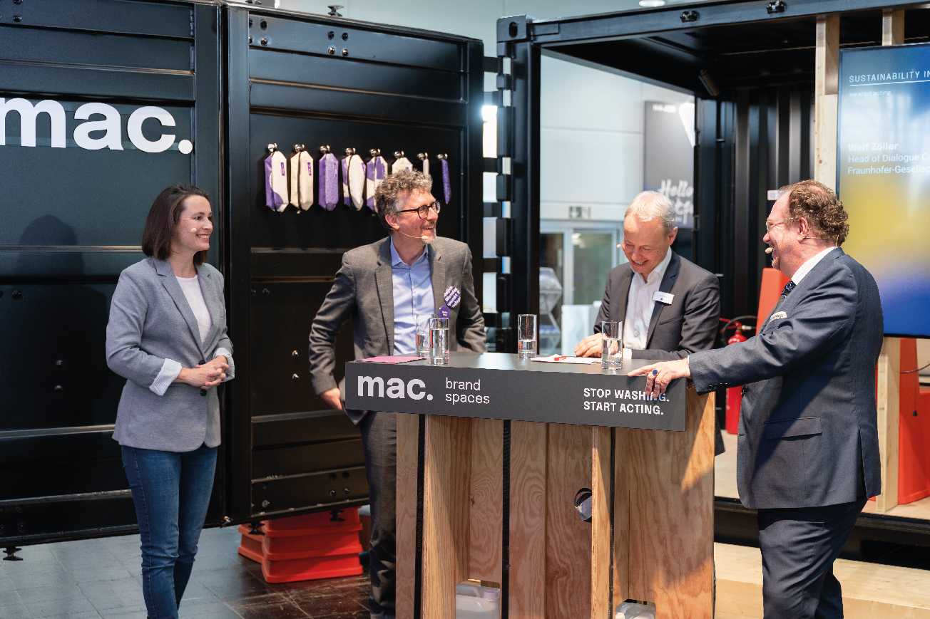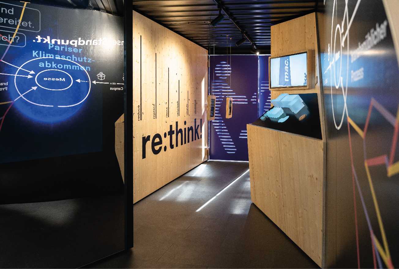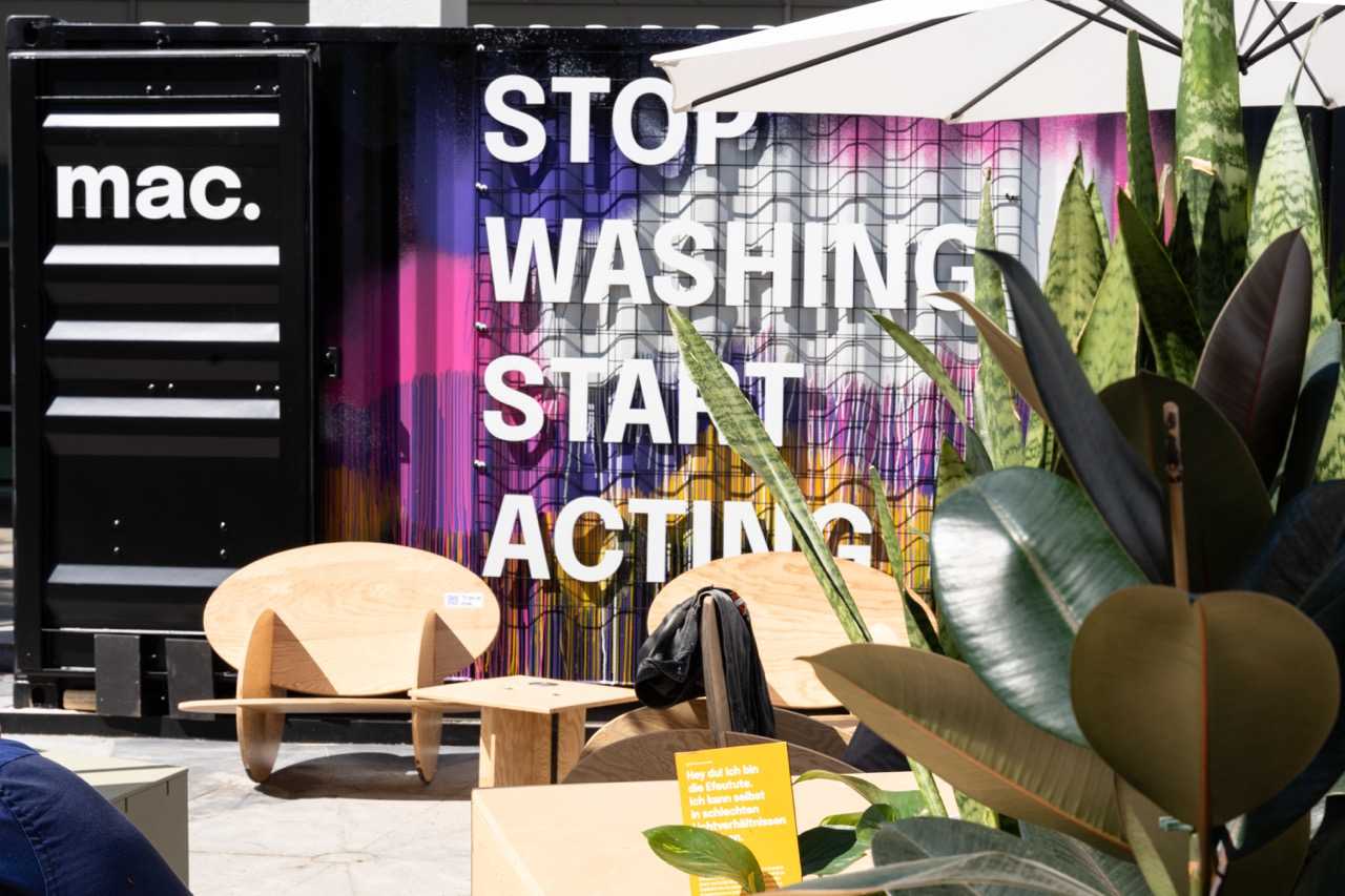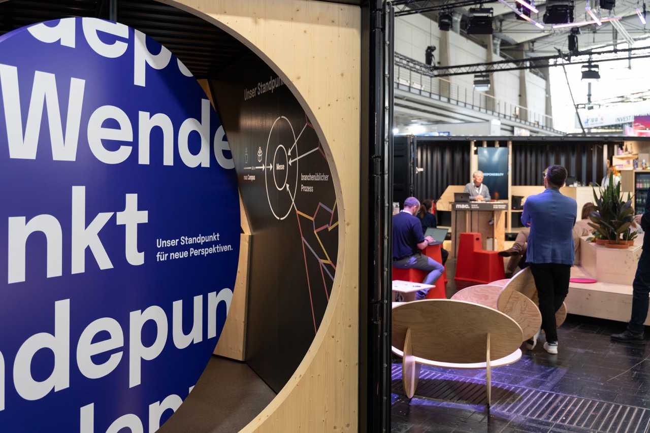 Kreiert wurde ein Begegnungsort mit zwei ausgestalteten Seecontainern für Bewirtung und einer begehbaren Präsentation für nachhaltige Wertschöpfungsketten. Über eine große Drehscheibe, dem sprichwörtlichen Wendepunkt, wurde der Besucher durch eine eigens entwickelte digitale und analoge Customer Journey geführt, die mit Herausforderungen konfrontiert, aber auch aufzeigt, mit welchen Lösungen, Maßnahmen und Einstellungen mac. in ökologischen, ökonomischen und sozialen Aspekten die Live-Kommunikation nachhaltig transformiert.