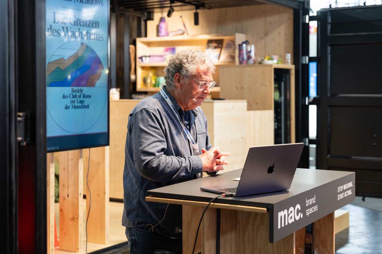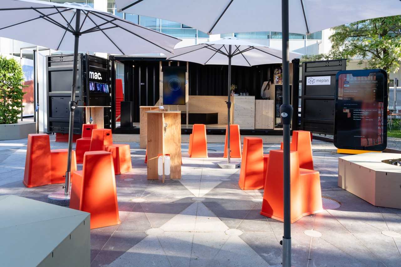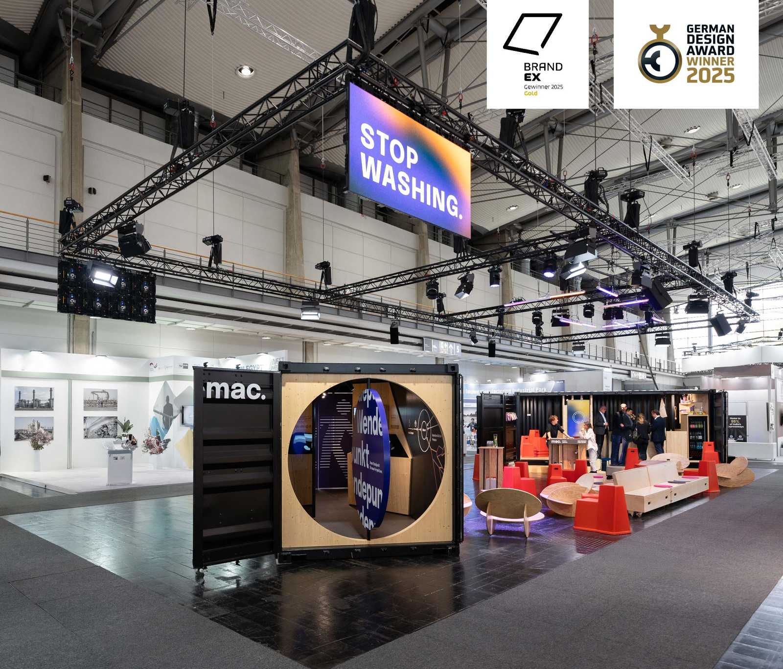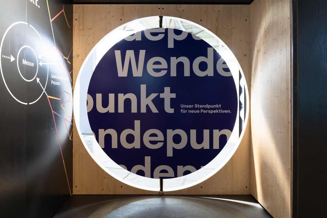 Kreiert wurde ein Begegnungsort mit zwei ausgestalteten Seecontainern für Bewirtung und einer begehbaren Präsentation für nachhaltige Wertschöpfungsketten. Über eine große Drehscheibe, dem sprichwörtlichen Wendepunkt, wurde der Besucher durch eine eigens entwickelte digitale und analoge Customer Journey geführt, die mit Herausforderungen konfrontiert, aber auch aufzeigt, mit welchen Lösungen, Maßnahmen und Einstellungen mac. in ökologischen, ökonomischen und sozialen Aspekten die Live-Kommunikation nachhaltig transformiert.